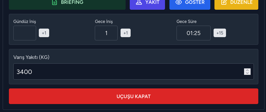 Uçuş sonunda uçuş sonu bilgilerinizi kaydederek logbook için gerekli olan iniş bilgisi ve gece süresini yaklaşık olarak buradan kaydedebilirsiniz. Kalan yakıt bilgisi zorunlu alan değildir. Uçuşu kapat dediğiniz zaman uçuşunuz kaydedilecektir.