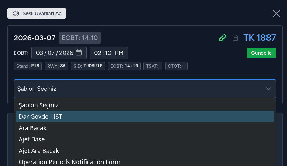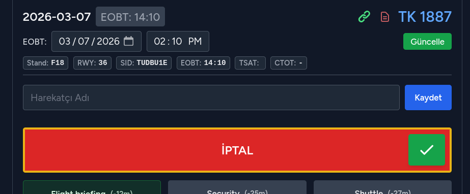 Şablonu seçilmiş olan bir uçuş artık yönetilebilir hale gelmiştir. Şablonda tanımlı zamanlar ve EOBT zamanı referans alınarak, kalan süre - ile, geçen süreler + ile gösterilir.
