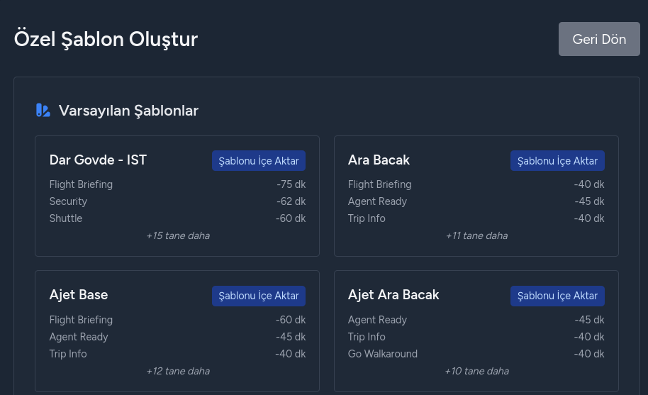 Seçtiğiniz şablonu kaydettiğinizde ise şablonda tanımlı olan süreler uçuş yönetme sayfasında buton olarak gösterilmeye başlar.