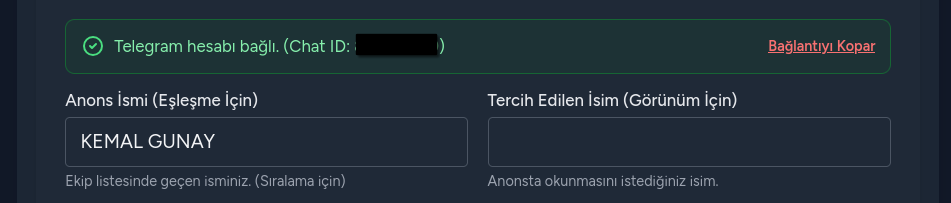 Sistem anons metninde isimleri ekip listesindeki sırası ile gösterir. Profile sayfanızda Anons İsmi kutusuna isminizi tam olarak ekip listesindeki şekilde yazmanız halinde isminiz ilk sırada gösterilecektir. Birden fazla isminiz varsa tercih edilen isim tanımı yaparak anons metninde bu ismin gösterilmesini sağlayabilirsiniz.