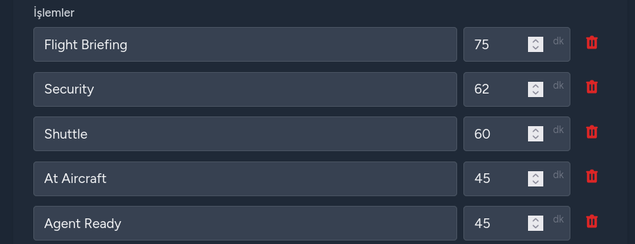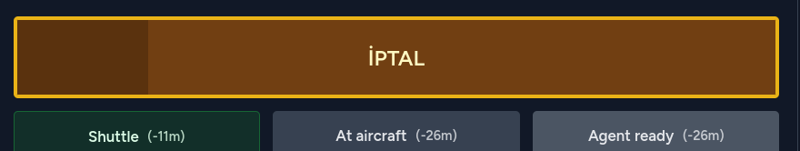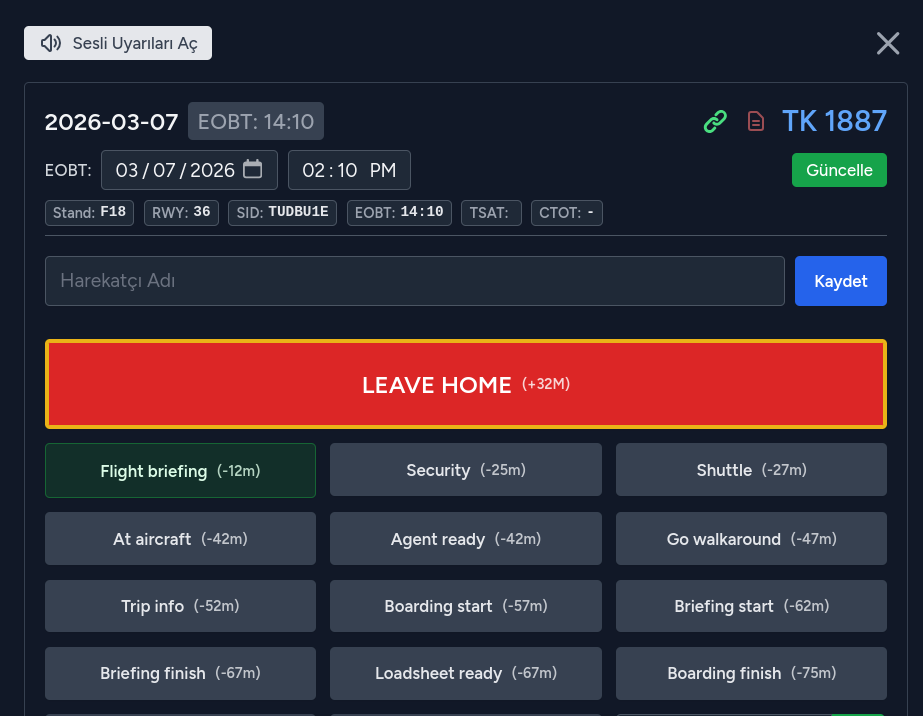 Sistem, takviminizde kalkış zamanı olarak kayıtlı olan EOBT saatini referans alır. Belirlediğiniz her bir aşamanın EOBT'den kaç dk öncesini referans alacağını siz belirlersiniz. Ekranda belirlediğiniz referans zamana kalan süre gösterilir. Buton şeklinde gösterilen bu aşamayı seçtiğinizde o anki zaman sisteme kaydedilir. Uçuş sonrasında kayıtlarınızı gördüğünüz sayfada hangi aşama saat kaçta tamamlanmış, hedefinizden kaç dakika önce veya sonra tamamlanmış hepsini topluca görebilirsiniz.