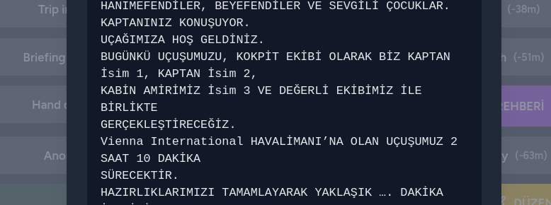 Nadiren ekip isimleri doğru şekilde okunamamaktadır. Anonsa başlamadan önce mutlaka isimleri kontrol ediniz, gerekirse Göster sayfasındaki Uçuş Ekibi sayfasından isimleri düzenleyiniz.