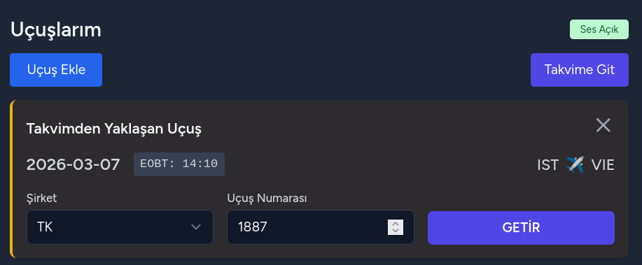 EOBT saati yaklaşan bir uçuştan burada tanımlanan dakika kadar öncesinde Uçuşlar sayfasında bir uçuş ekleme penceresi açılır. Burada profilinizde tanımlamış olduğunu şirket kodlarından birini seçmeniz ve uçuş no yazmanız istenir.